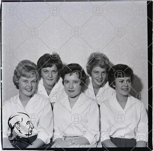 fem kvinnor, svartvitt foto, 1950-tal, kläder, leende, porträtt, gruppbild, frisyrer, vintage, mode, ungdomar, ansikten, bakgrund, stil, fotografi