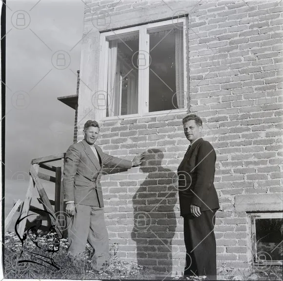 två män, byggnad, tegelvägg, fönster, svartvitt, kläder, kostymer, skugga, gräs, landskap, 1900-tal, porträtt, utomhus, stil, historisk, fotografi, vänner, pose, arkitektur, natur, gammal, traditionell, tidsepok, ansikten, uttryck, samarbete, miljö, kultur, samhälle, minnen