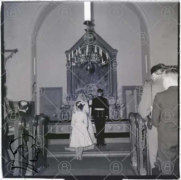 bröllop, kyrka, altare, brud, brudgum, gäster, klänning, tradition, ceremoni, ljuskrona, bön, familj, vittne, 1960-tal, svartvitt, fest, kärlek, glädje, högtid, minnen, samling, andakt, ungdom, kläder, blomster, dekoration, stämning, fotografi, historia