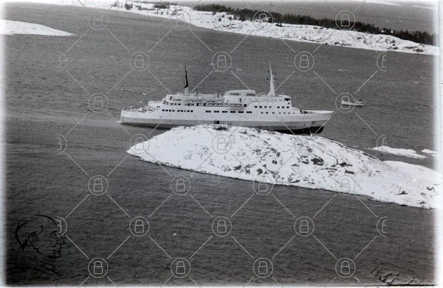 fartyg, båt, hav, ö, snö, vinter, landskap, sjö, transport, passagerare, skärgård, svartvit, navigering, resande, kust, natur, is, fjärran, horisont, sjöfart