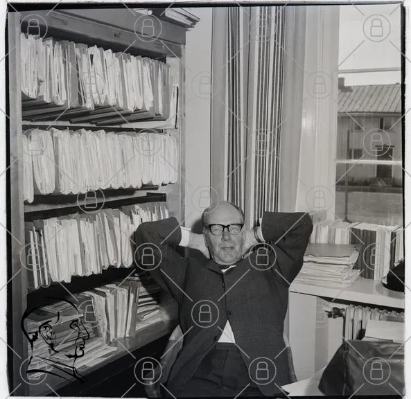 gammal man, kontor, arkiv, dokument, filer, glasögon, stol, fönster, svartvitt, inomhus, avslappnad, kläder, hylla, papper, skrivbord, tid, historia, arbete, kontorsmiljö, äldre, manlig, sittande, kontorsmaterial, organisation, administration, traditionell, retro, professionell, lugn, kontorsarbete