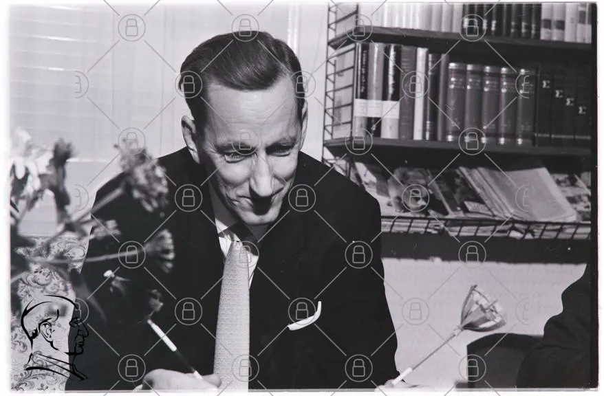 man, kostym, slips, svartvitt, skrivande, blommor, bokhylla, kontor, 1950-tal, porträtt, elegant, eftertänksam, ansikte, stil, professionell, inomhus, dokument, penna, klassisk, vintage, litteratur, fokus, detaljer, uttryck, manlig, affärsmann, interiör, kontorsmiljö, gammal, svartvitt foto