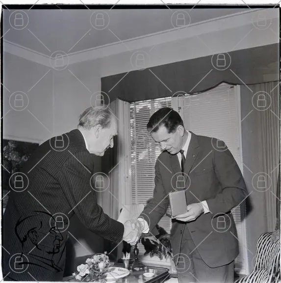 handshake, män, rum, inredning, fönster, blommor, present, svartvitt, kläder, möbler, 1900-tal, affärsmöte, vänskap, formell, gest, interaktion, samtal, diplomati, relationer, historia