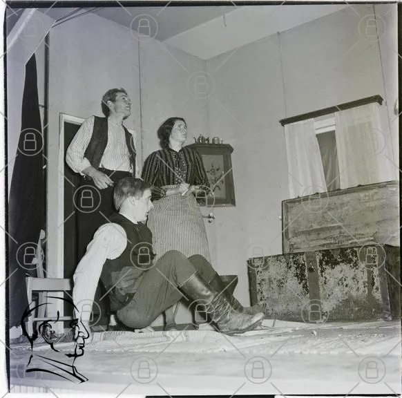 svartvit, gammal, teater, skådespelare, kostymer, inomhus, scen, möbler, kista, familj, 1900-tal, traditionell, kläder, dramatiskt, interiör, uttryck, rekvisita, historia, kultur, porträtt