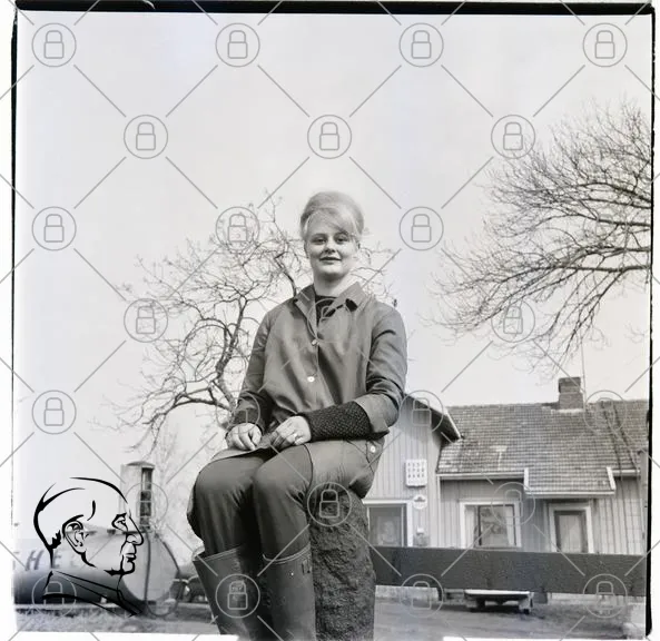 kvinna, sittande, träd, hus, svartvitt, gummistövlar, leende, utomhus, 1900-tal, fotografi, landskap, natur, kläder, stil, gammal, traditionell, bakgrund, porträtt, ungdom, sommar, historia, enkelhet, avslappnad, miljö, rural, nostalgi, charm, personlighet, uttryck