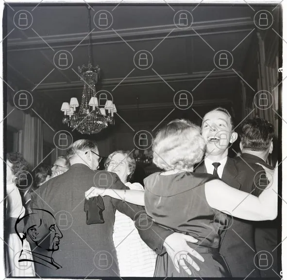 dans, fest, människor, glädje, skratt, par, klänning, kostym, kram, interiör, ljuskrona, svartvitt, 1950-tal, socialt, evenemang, mingel, leende, musik, nöje, sällskap
