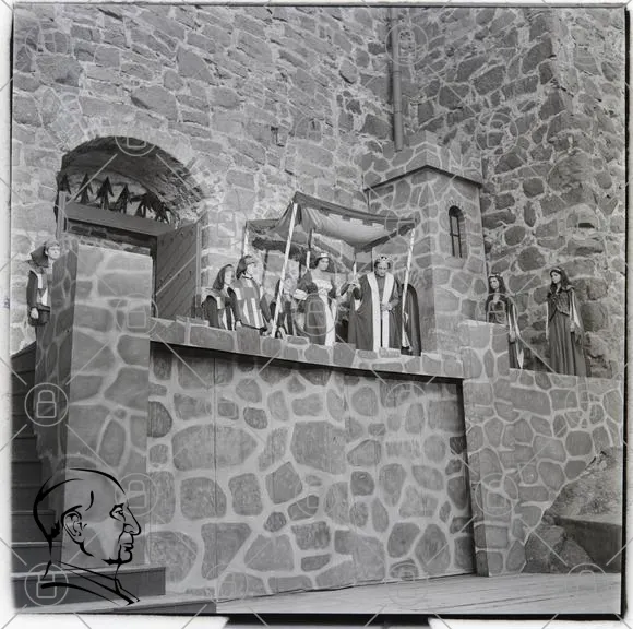 medeltid, teater, uppträdande, kostymer, stenhus, scen, skådespelare, kläder, historiskt, dramatiskt, publik, föreställning, tradition, kultur, konst, svartvitt, gammal, ceremoni, fest, rekvisita, byggnad, arkitektur, grupp, masker, kloster, medeltida, skådespel, scenografi, folklig, evenemang, historia