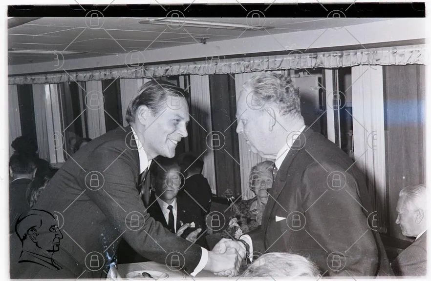 handshake, möte, affärsmän, svartvitt, kläder, kostym, leende, bord, fest, dignitärer, 1960-tal, interiör, socialt, samarbete, diplomati, tradition, formalitet, samtal, evenemang, representation, män, kvinnor, bakgrund, uppvaktning, vänskap, relationer, historia, kultur, nätverkande, samling