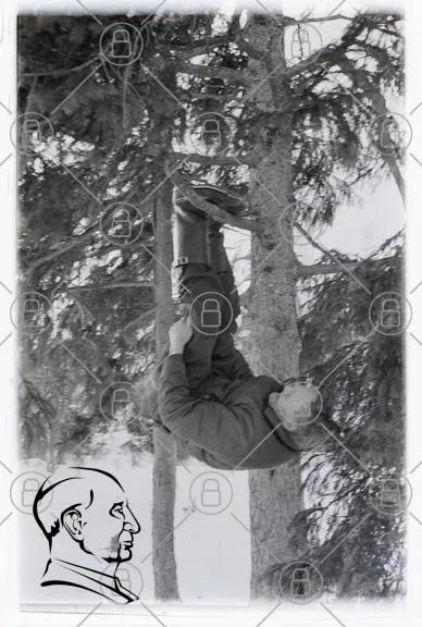 man, hängande, träd, snö, vinter, svartvitt, kläder, stövlar, natur, fotografering, ovanlig, position, skog, människa, utomhus, balans, humor, vintage, retro, aktivitet, friluftsliv