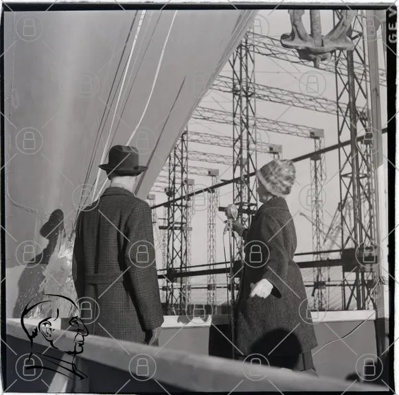 man, woman, ship, harbor, cranes, industrial, black and white, clothing, hats, observation, maritime, construction, vintage, architecture, sea, dock, equipment, people, outdoors, 20th century