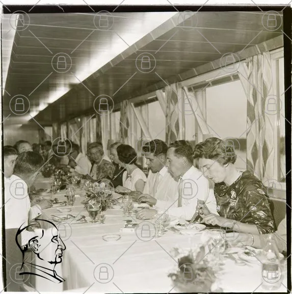 middag, fest, båt, människor, bord, mat, dryck, kläder, 1950-tal, socialt, samvaro, fönster, dukat, glas, servetter, leenden, samtal, eleganta, dekoration, stil, gemenskap, festlig, atmosfär, restaurang, tradition, nöje, samling, evenemang, måltid, njutning