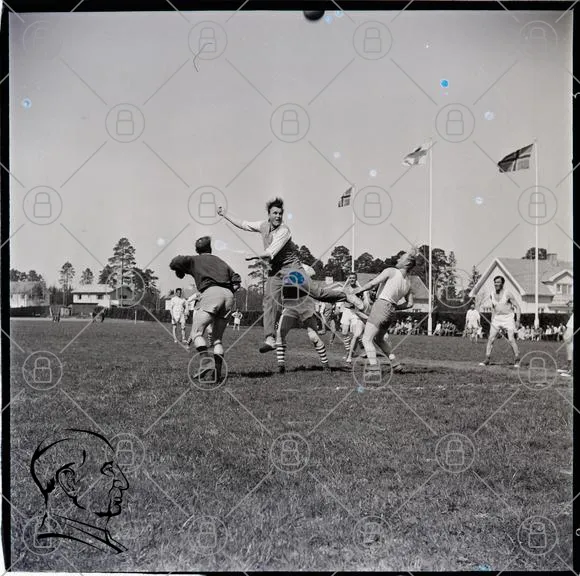 fotboll, spelare, match, gräs, mål, hopp, flaggor, publik, sport, lag, träning, tävling, utomhus, 1900-tal, manliga spelare, aktivitet, idrott, fotbollsmål, skott, passning