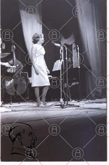 sångerska, scen, mikrofoner, klänning, musik, band, piano, svartvitt, uppträdande, publik, 1960-tal, artist, live, föreställning, underhållning, kultur