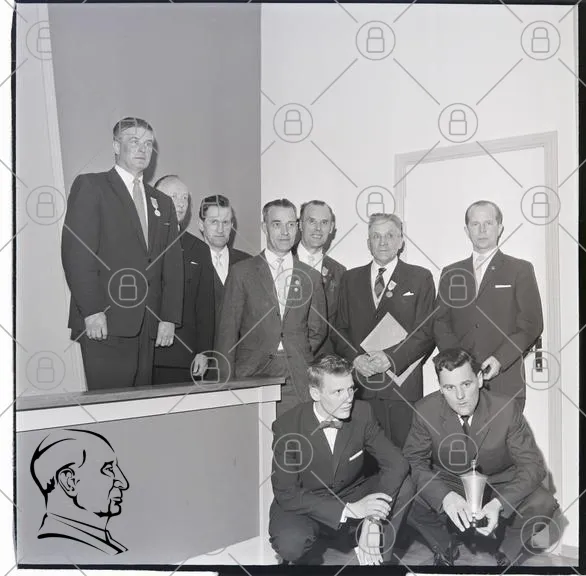 män, kostymer, möte, grupp, svartvitt, 1950-tal, affärsmän, stående, sittande, formella kläder, inomhus, porträtt, professionella, samarbete, traditionell, stil, konferens, presentation, dokument, namnskyltar, leenden, allvarliga, samling, organisation, historia, retro, vintage, fotografi