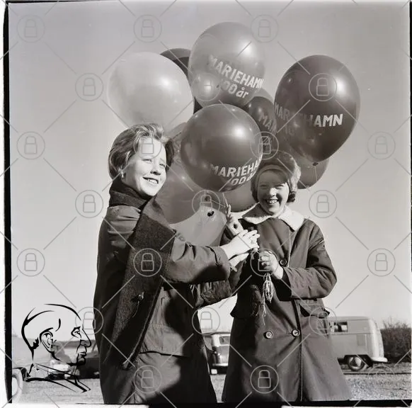 ballonger, Marienhamn, kvinnor, fest, svartvitt, 1960-tal, glädje, utomhus, kläder, leende, evenemang, fotografering, tradition, samling, festligheter, nostalgi, vänskap, jubel, minnen, historia, kultur