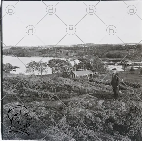 man, landskap, sjö, träd, hus, klippa, natur, svartvit, fotografi, 1900-tal, kust, vy, sommar, grönska, båt, fjärran, stillhet, tradition, historia, person, kläder, hatt, utsikt, lugn, landsbygden, skärgård, berg, växter, miljö, kultur