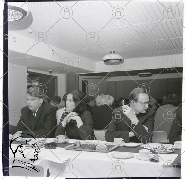 svartvit, fotografi, människor, bord, kaffe, te, kakor, kläder, 1960-tal, inomhus, möte, diskussion, stil, retro, interiör, belysning, ansiktsuttryck, socialt, samvaro, mat, dryck, samtal, grupp, traditionell, formell, evenemang, stilren, elegans, kultur, historia, tidsepok