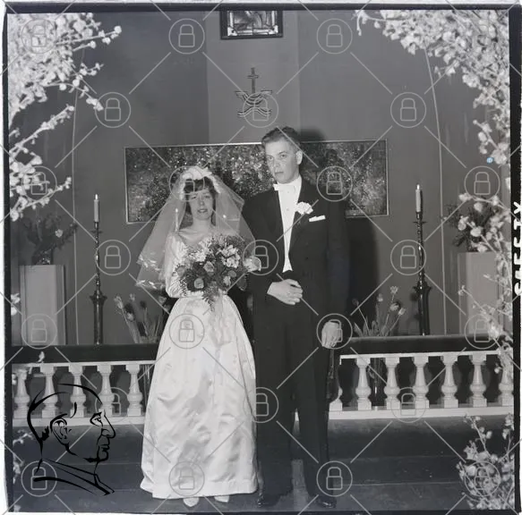 bröllop, brud, brudgum, klänning, kostym, bukett, blommor, vigsel, fest, dekoration, ljus, bakgrund, fotografi, svartvitt, tradition, kärlek, par, ceremonin, 1950-tal, stil, elegans, bröllopsceremoni, brudslöja, leende, minne, familj, festligheter, romantik, samling