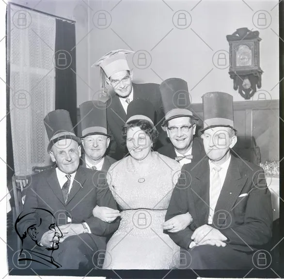 grupp, människor, hattar, kostymer, klänning, leende, fest, fotografi, 1950-tal, tradition, samling, svartvitt, ceremoni, glädje, familj, vänner, firande, stil, gammal, minnen