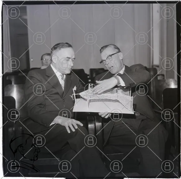 möte, presentation, män, kostym, dokument, diskussion, bänk, åhörare, 1950-tal, teknik, prototyp, plan, idé, forskning, innovation, affärsmöte, skiss, modell, papper, glasögon