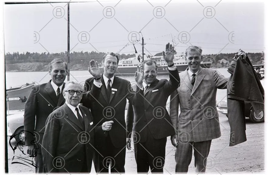 män, kostymer, hälsningar, hamn, båt, svartvitt, gruppfoto, 1960-tal, affärsmän, skärgård, Sverige, maritim, professionella, leenden, möte, tradition, stil, vänskap, samarbete, historia, resor