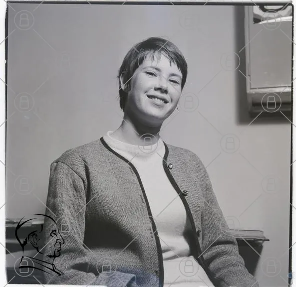 porträtt, kvinna, leende, svartvitt, kläder, inomhus, sittande, 1960-tal, ungdom, naturligt ljus, avslappnad, fotografi, retro, stil, ansiktsuttryck, personlig, enkel, vardaglig, interiör, nostalgi, mode, uttryck, charmig, klassisk, tidlös, atmosfär, känsla, ungdomlig, skönhet