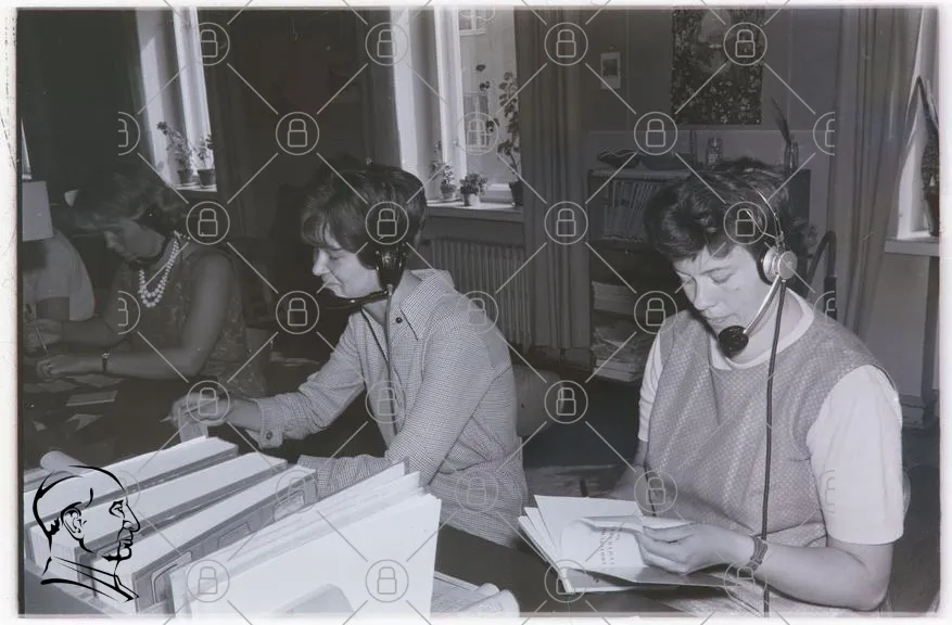 svartvit, kontor, kvinnor, headset, arbete, telefon, skrivbord, anteckningar, böcker, 1960-tal, kommunikation, kontorsmiljö, koncentration, samtal, dokument, skrivmaskin, kontorsutrustning, arbetsplats, vintage, retro