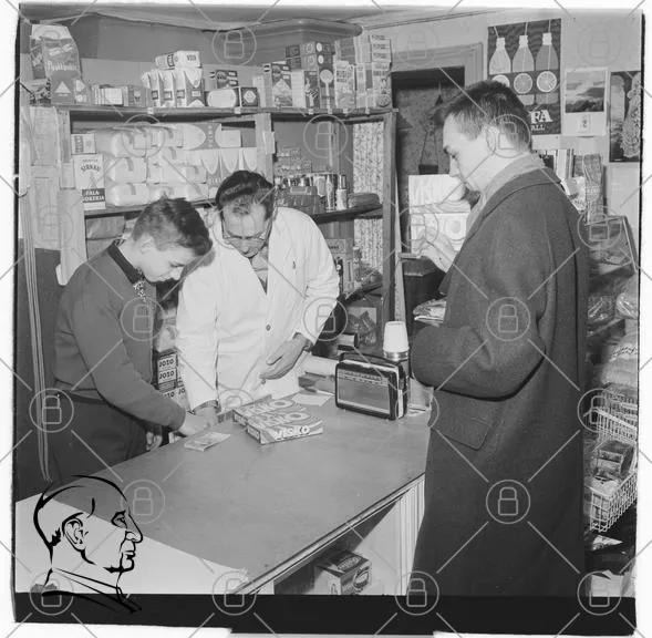 butik, försäljning, kunder, kassör, varor, 1960-tal, man, pojke, vit rock, kassaapparat, hyllor, livsmedel, handel, service, retro, svartvitt, interiör, disk, produkter, förpackningar, samtal, shopping, lokal, traditionell, samhälle, ekonomi, detaljhandel, män, ungdom, affär, kundservice