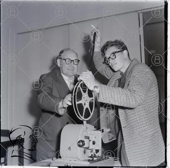 filmprojektor, män, glasögon, teknik, utbildning, 1950-tal, svartvitt, film, rullfilm, kontor, arbete, samarbete, maskin, kreativitet, historia, retro, lärande, hantverk, professionell, presentation