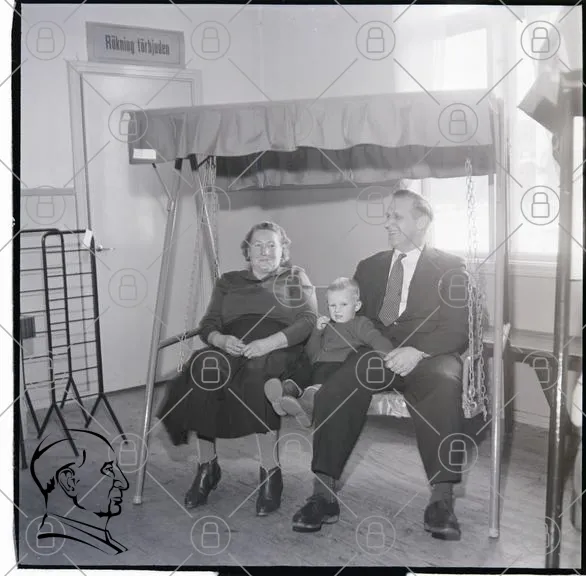 familj, barn, vuxna, sittande, inomhus, leende, sväng, möbler, rum, svartvitt, retro, 1900-tal, traditionell, samvaro, interiör, gemenskap, glädje, kläder, stil, fotografi, nostalgi, barnvagn, väggar, fönster, belysning, trä, golv, skugga, ansikten