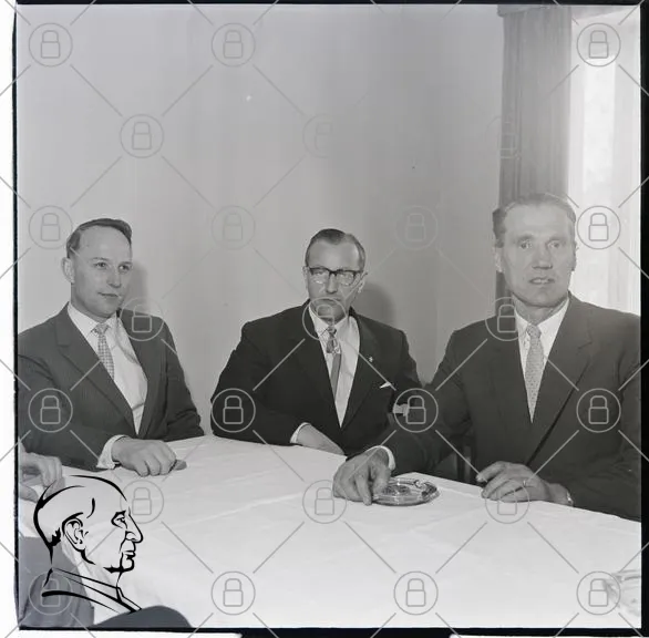 män, kostym, möte, bord, samtal, 1900-tal, svartvitt, affärsmän, glasögon, kavaj, slips, kaffekopp, diskussion, professionell, inomhus, formell, kläder, uttryck, ansikten, interaktion, grupp, sittande, stil, traditionell, bakgrund, fönster, duk, platta, tallrik