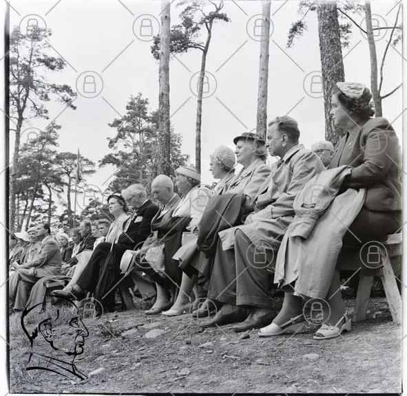 grupp, människor, utomhus, sittande, bänkar, skog, träd, kläder, hattar, kvinnor, män, äldre, samling, natur, svartvitt, fotografi, park, evenemang, publik, sommar