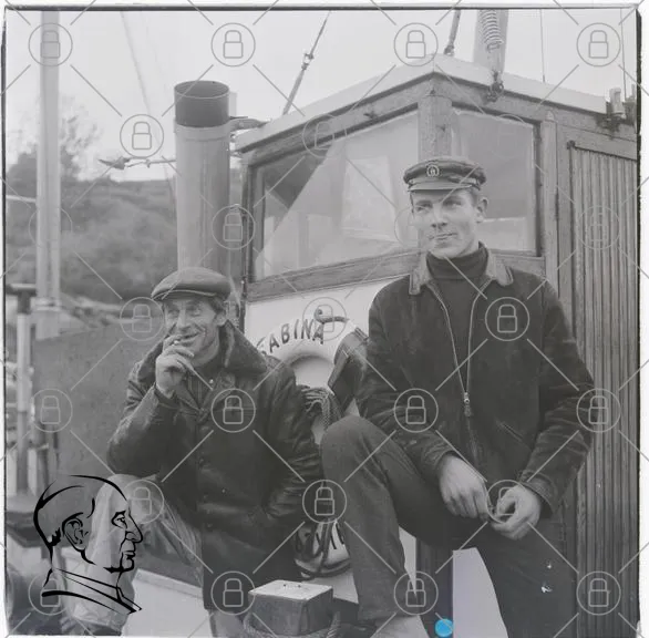 båt, sjömän, kabin, svartvitt, marin, kläder, hattar, träbåt, fotografi, 1900-tal, män, rökning, fiske, hamn, traditionell, nostalgi, landskap, verktyg, arbete, historia