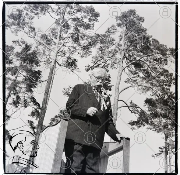 man, kostym, träd, utomhus, tal, mikrofon, himmel, svartvitt, äldre, glasögon, slips, natur, scen, evenemang, publik