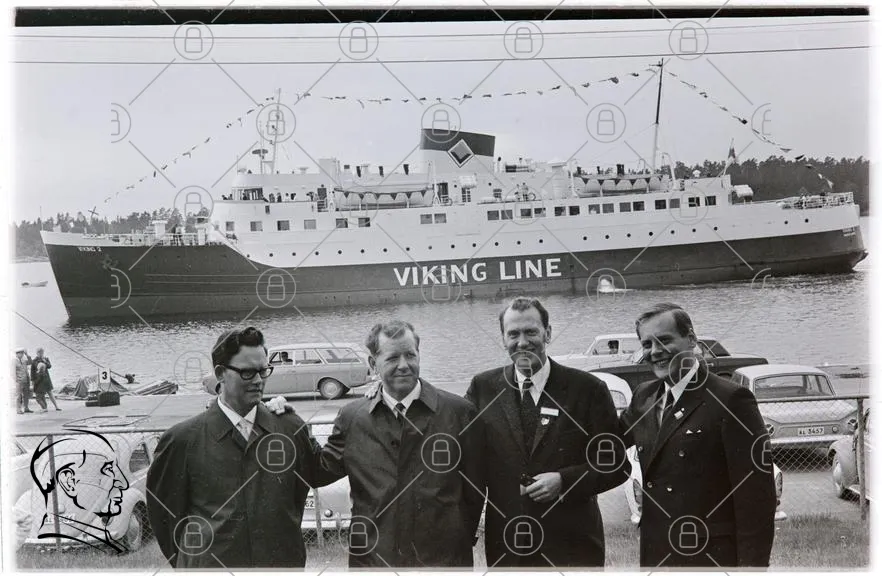 Viking Line, båt, färja, män, kostymer, 1960-tal, hamn, bil, svartvitt, sjöfart, kläder, grupp, resor, tradition, marin, flaggor, fotografering, historia, transport, nöje, skärgård, Sverige, Finland, passagerare, sjö, landskap, arkitektur, kultur, företag