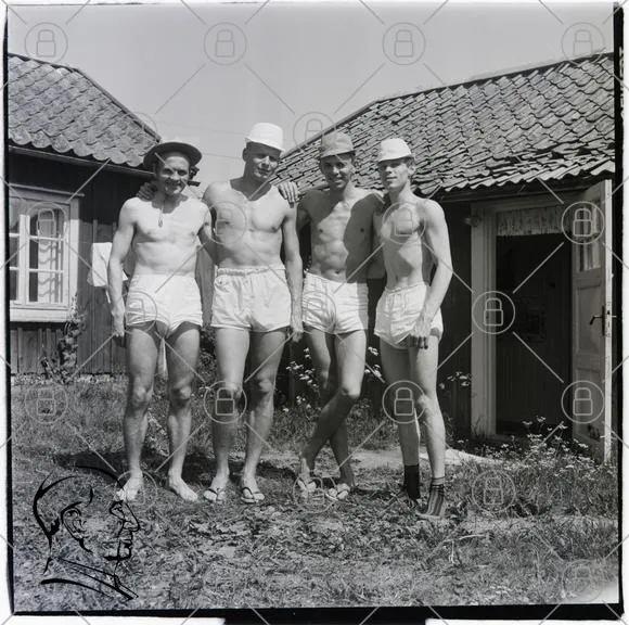 fyra män, badkläder, sommar, utomhus, svartvitt, historisk, byggnader, hattar, shorts, bar överkropp, fotografering, 1900-tal, traditionell, landsbygd, vänner, avslappnad, natur, gräs, stil, kläder, ungdomar, gemenskap, soligt, leende, sportig, kultur, nostalgi, fritid, badhus