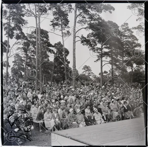 publik, träd, samling, kvinnor, kläder, evenemang, utomhus, åskådare, svartvit, scen, natur, folkmassa, tradition, fest, gemenskap, 1900-tal, historisk, kultur, aktivitet, samhörighet