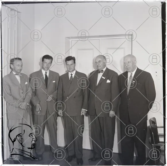män, kostymer, slipsar, svartvitt, gruppfoto, inomhus, dörr, 1950-tal, formella kläder, affärsmän, stående, porträtt, möte, stil, traditionell, professionell, ansiktsuttryck, samarbete, historia, vintage, klädsel, interiör, socialt, representation, män i kostym, affärsmöte, fotografi, klassisk, elegans, tidsepok