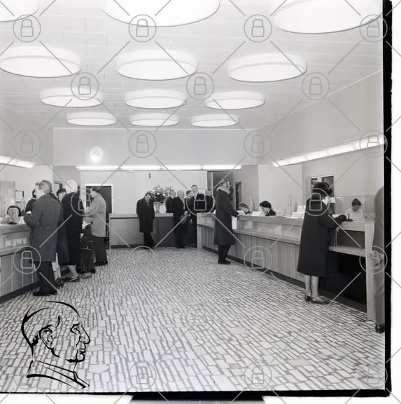 bank, inredning, 1950-tal, människor, kontor, reception, belysning, väggar, golv, skrivbord, kö, affär, svartvitt, vintage, stil, service, växter, kassa, kläder, formell, arkitektur, design, socialt, interiör, offentlig, rum, modern, tidlös, atmosfär, professionell