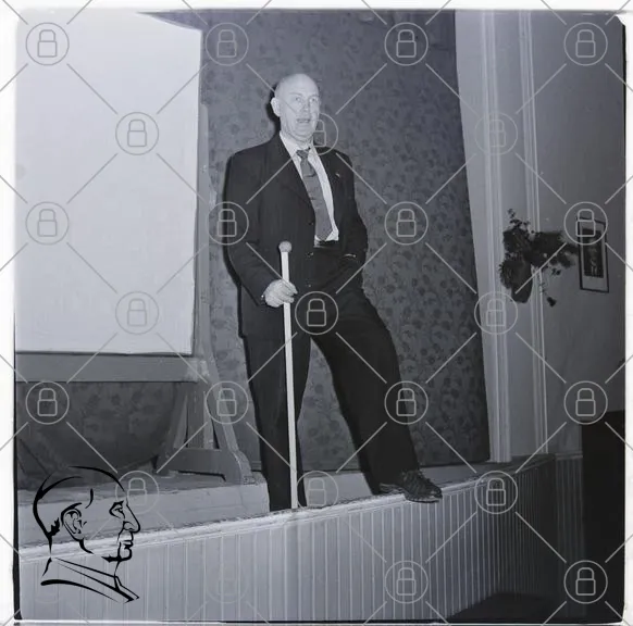 man, käpp, talare, scen, svartvitt, kostym, publik, föreläsning, 1940-tal, kläder, inomhus, stående, presentation, mikrofon, bakgrund, vägg, föreställning, evenemang, gestikulera, uttryck, äldre, formell, stil, traditionell, samling, kultur, historia, samhälle, interaktion, kommunikation