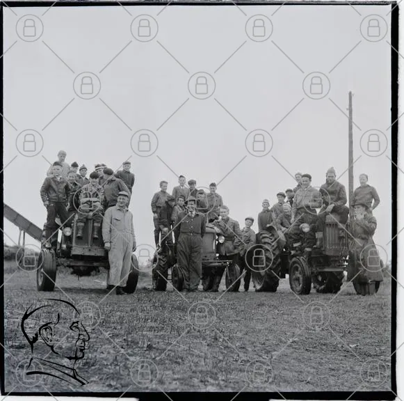 traktorer, män, arbete, jordbruk, grupp, historisk, svartvit, landskap, kläder, maskiner, fält, fotografering, tradition, samarbete, utomhus, 1900-tal, teknik, bönder, fordon, gemenskap, rural, landsbygd, jordbrukare, traktor, arbetskläder, mänsklig aktivitet, kollektiv, industri, nostalgi, teamwork