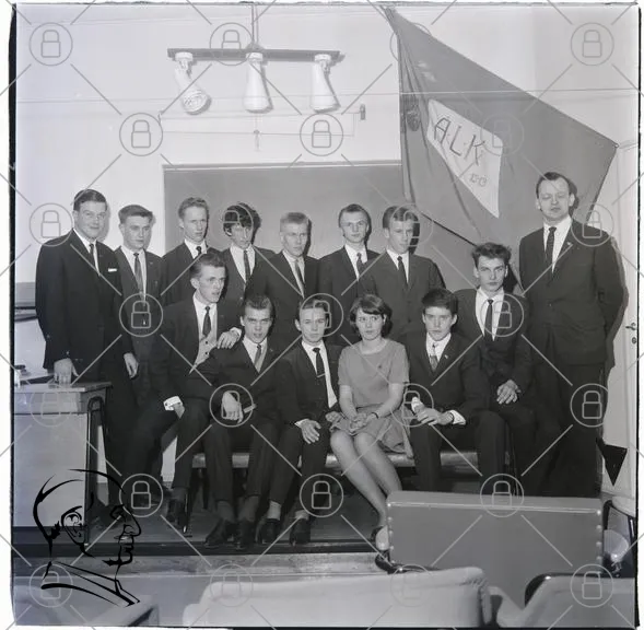 klassfoto, 1960-tal, elever, skolklass, svartvitt, kostymer, flagga, ALK, inomhus, bänkar, lärare, ungdomar, pojkar, flicka, tradition, utbildning, gruppbild, retro, nostalgi, skola, klassrum