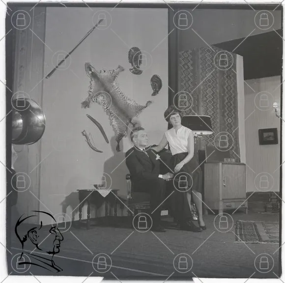 man, kvinna, sittande, inredning, svartvitt, djurhud, väggkonst, möbler, 1900-tal, fotografi, stil, kläder, retro, hem, kultur, tradition, sällskap, leende, interiör, föremål, skulptur, konstverk, vintage, elegans, tidsepok, porträtt, socialt, samspel, atmosfär, historia