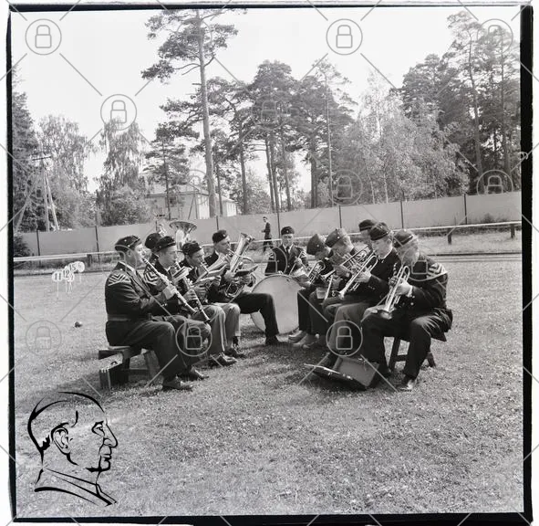 orkester, musiker, utomhus, uniformer, instrument, träd, park, gräsmatta, trumpet, horn, dirigent, bänkar, svartvitt, konsert, militär, musik, ensemble, grupp, sommar, evenemang