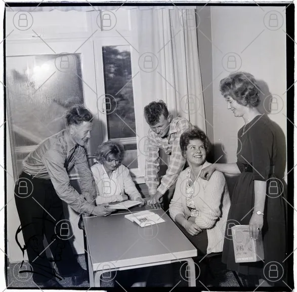 personer, bord, skrivande, leende, inomhus, fönster, kläder, 1960-tal, samarbete, grupp, kvinnor, män, dokument, fotografi, svartvitt, interiör, samtal, vänskap, aktivitet, kontor, möte
