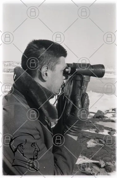 man, kikare, vinter, snö, landskap, observation, svartvitt, kläder, handskar, fotografi, natur, is, fjärran, fokus, utomhus, kallt, 1900-tal, forskning, äventyr, utforskning, detaljer, retro, stil, människa, utrustning, syn, avstånd, miljö, stillhet