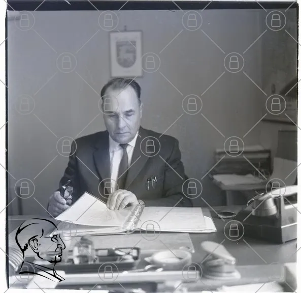 man, skrivbord, dokument, kontor, bläckpenna, pärm, telefon, papper, kostym, glasögon, inredning, svartvitt, affärsmann, arbete, fokus, skrivande, kontorsmaterial, tid, 1900-tal, professionell, seriös, administration, kontorsliv, kontorsutrustning, kontorsmiljö, manlig, affärsliv, dokumentation, organisation, planering