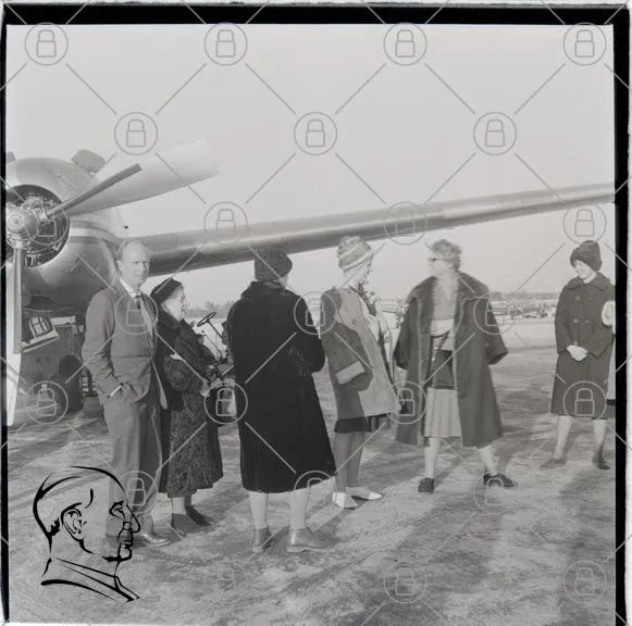 flygplan, människor, kläder, 1920-tal, vinter, resande, kvinnor, män, hattar, flygplats, svartvitt, mode, historiskt, samling, fotografering, stil, utomhus, grupp, ankomst, äventyr