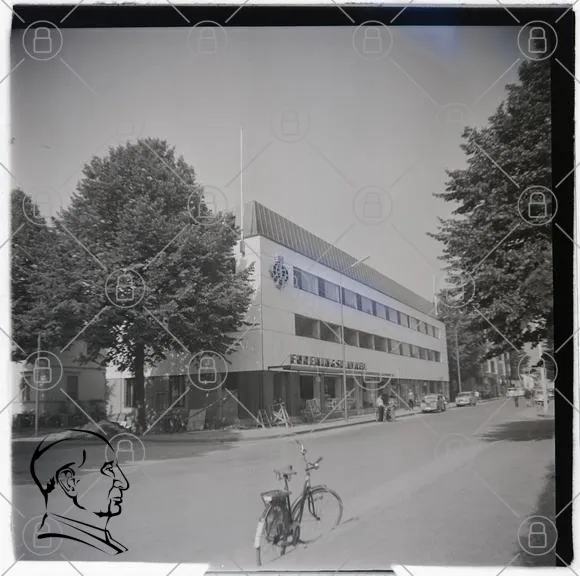 byggnad, cykel, träd, gata, fasad, fönster, flagga, människor, asfalt, parkering, arkitektur, kontor, stadsbild, svartvit, landskap, väg, skylt, modern, design, urban, miljö, sommar, cykelställ, byggnadsstil, grönska, trottoar, trafik, byggarbetsplats, entré