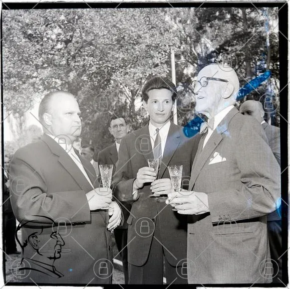 män, kostymer, glas, skål, fest, svartvitt, träd, utomhus, 1950-tal, samling, högtid, män i kostym, socialt sammanhang, firande, historisk, kläder, ansikten, stil, elegans, tradition, gemenskap, fotografering, minnen, festligheter, artighet, vänskap, samvaro, glädje